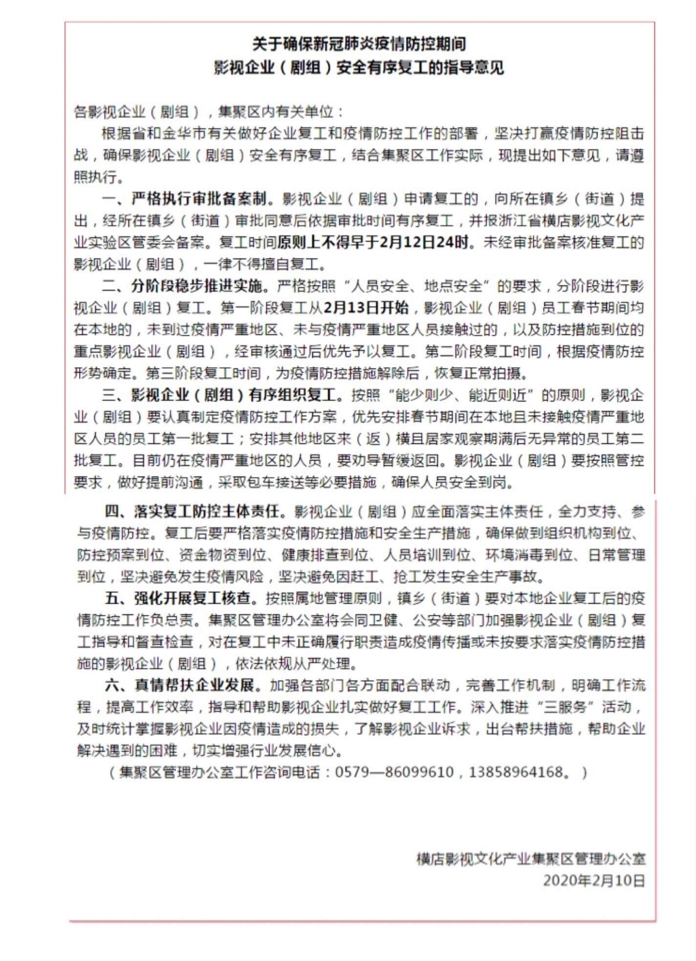 【横店影视城发布剧组复工通知】 需备案通过审核之后复工,第一阶段复工2月13日开始。